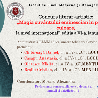 Concurs literar-artistic:”MAGIA CUVÂNTULUI EMINESCIAN ÎN POEZIE ȘI CULOARE”, la nivel internațional, ediția a VI-a, ianuarie 2024.