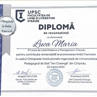Administrația LLMM informează cu recunoștință despre succesul strălucit obținut de către elevii noștri la Olimpiada Instituțională la Limba franceză 2024, organizată de către Universitatea Pedagogică de Stat “Ion Creangă “